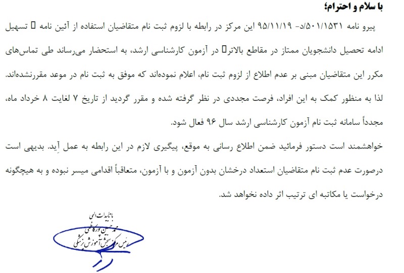 فرصت مجدد جهت ثبت نام آزمون کارشناسی ارشد برای متقاضیان استعداد درخشان