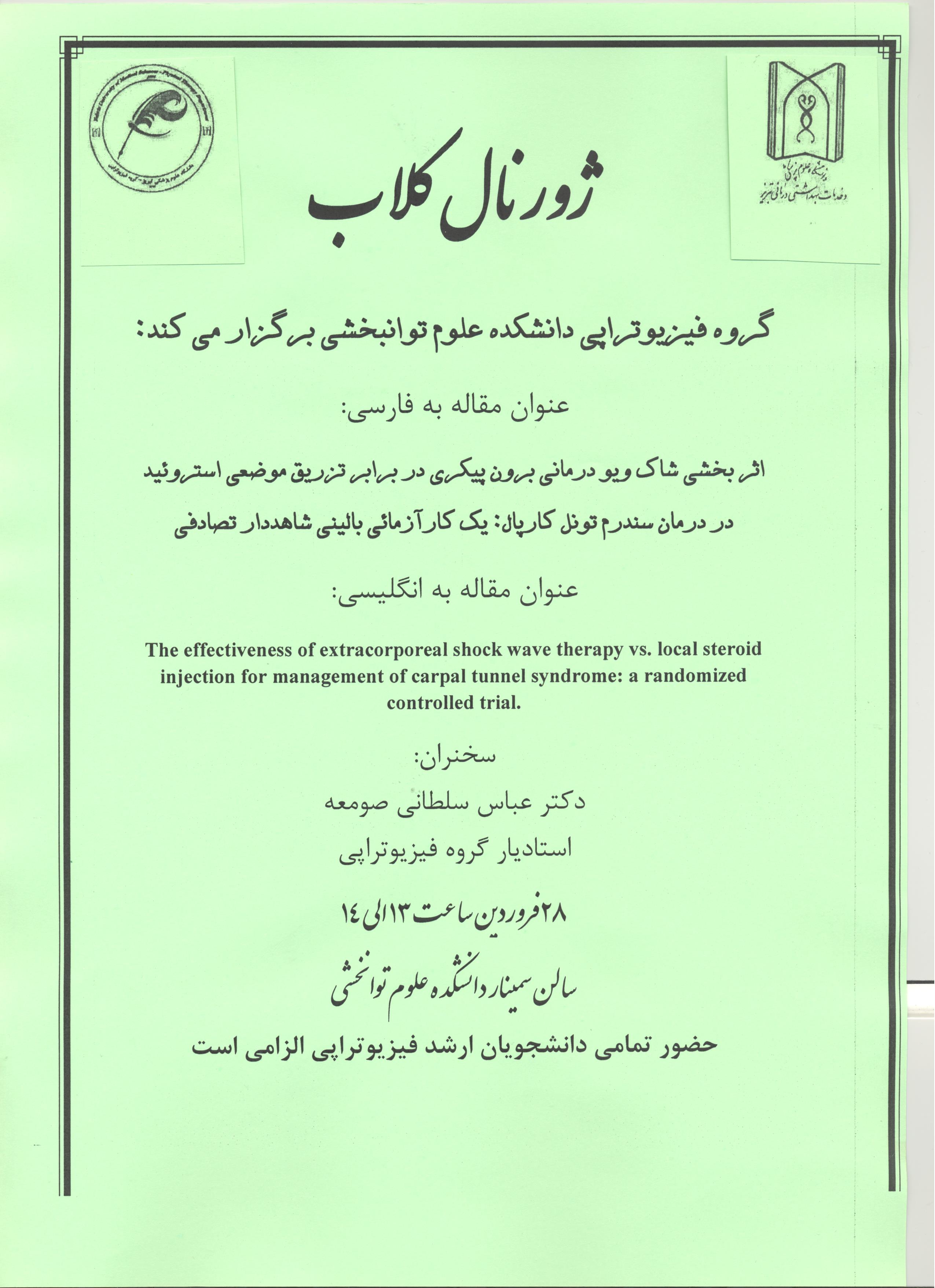 ژورنال کلاب ژورنال کلاب گروه فیزیوتراپی دانشکده علوم توانبخشی کد خبر : 53324 کپی کلمات کلیدی : ژورنال کلاب سندرم تونل کارپ دکتر عباس سلطانی شاک ویو