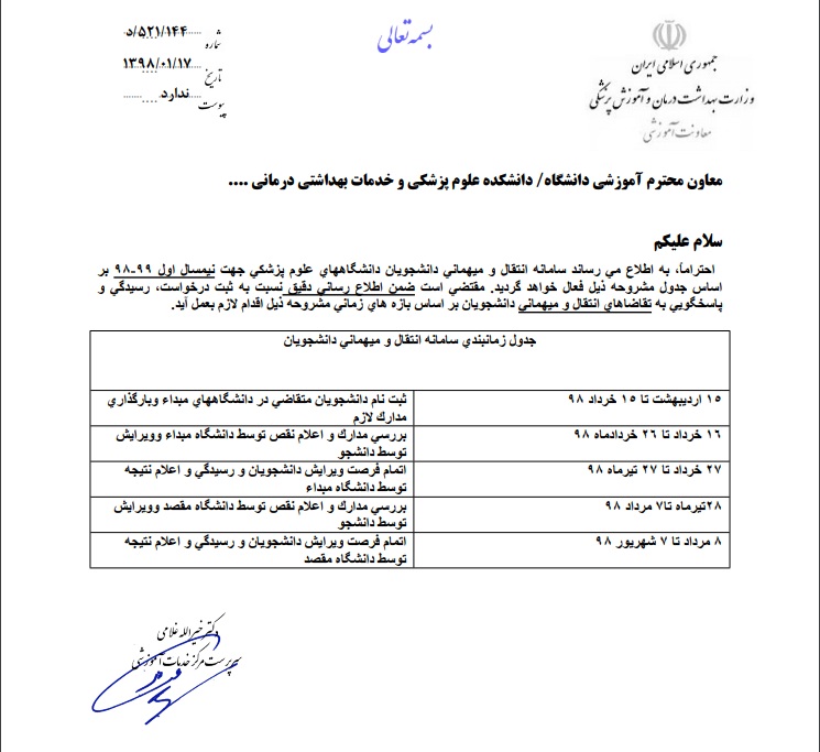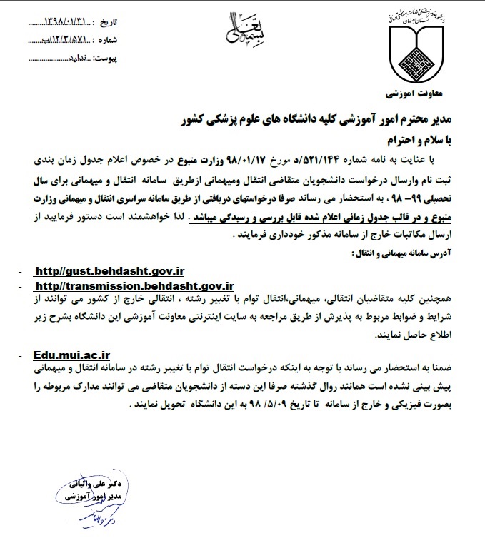 اطلاعیه در خصوص میهمان و انتقالات دانشجویان