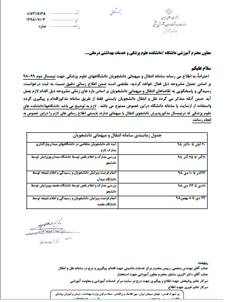 اعلام زمان ویرایش دانشجویان و رسیدگی و اعلام نتیجه توسط دانشگاه مبداء در سامانه انتقال و مهمانی دانشجویان دانشگاههای علوم پزشکی کشور در نیمسال دوم 99 – 98