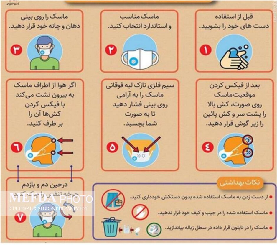 * دست ها را قبل از لمس ماسک با ژل ضدعفونی کننده الکلی یا آب وصابون، ضدعفونی کنید.