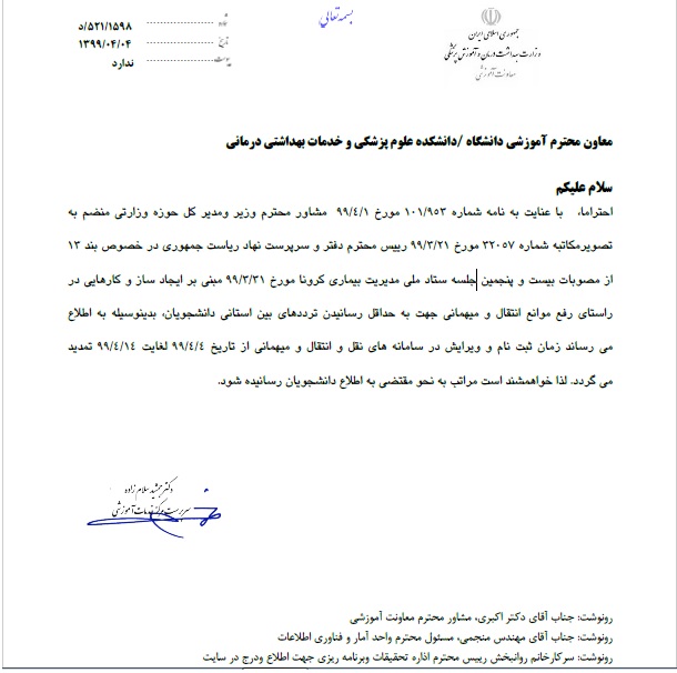 تمدید مهلت انتقال و مهمانی دانشجویان در راستای تصمیم ستاد ملی مدیریت بیماری کرونا ابلاغ شد کد خبر : 53435 کپی کلمات کلیدی : دانشگاه علوم پزشکی تبریز دانشکده توانبخشی انتقال دانشجویی