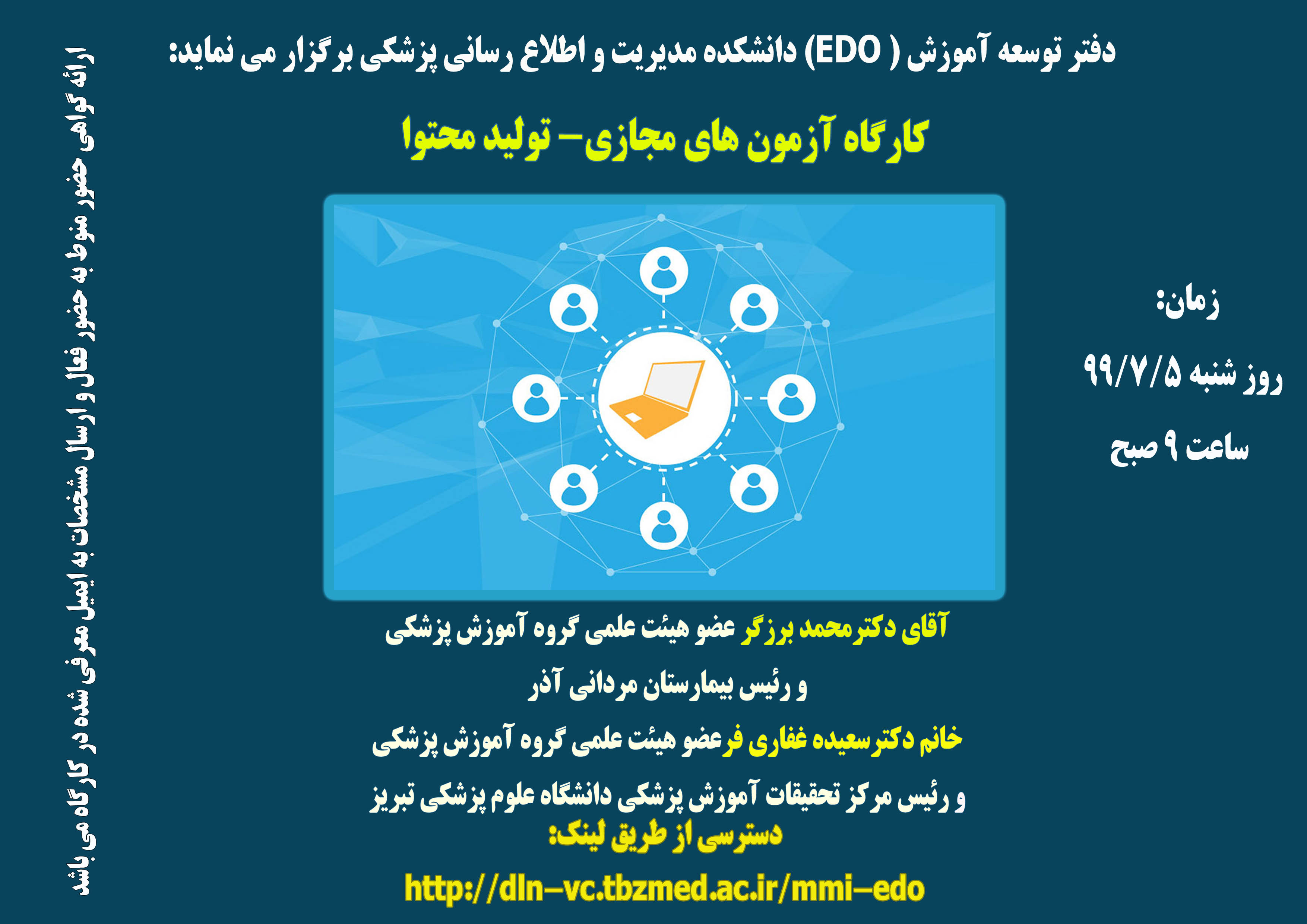 کارگاه آزمون های مجازی و تولید محتوا روز شنبه مورخه 99/7/5 ساعت 9 صبح برگزار خواهد شد.