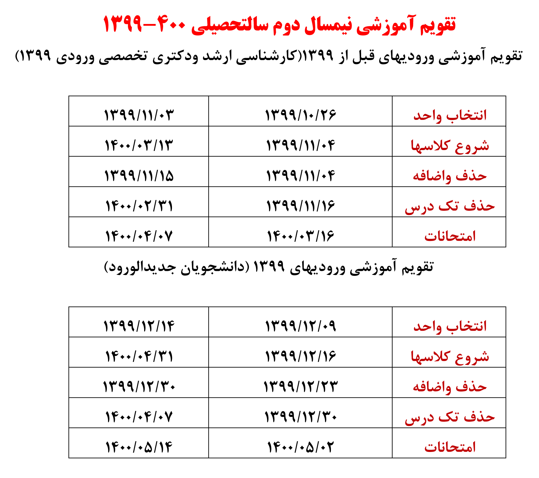 معاونت آموزشی دانشگاه تقویم آموزشی نیمسال دوم 1399 را به شکل زیر برای ورودیهای قبل از 1399 و دانشجویان جدید الورود اعلام کرد .