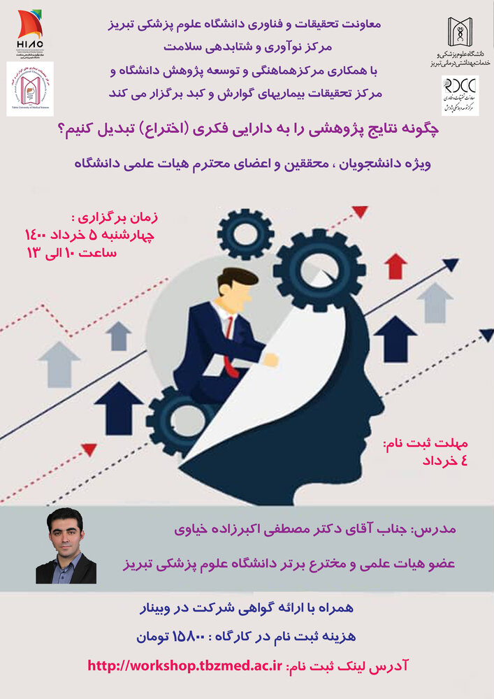وبینار «چگونه نتایج پژوهشی را به دارایی فکری (اختراع) تبدیل کنیم؟» از ساعت ۱۰ تا ۱۳ روز چهارشنبه، ۵ خرداد ۱۴۰۰، برگزار خواهد شد و مدرسی این کارگاه را دکتر مصطفی اکبرزاده، عضو هیات علمی و مخترع برتر دانشگاه علوم پزشکی تبریز، بر عهده دارد.
