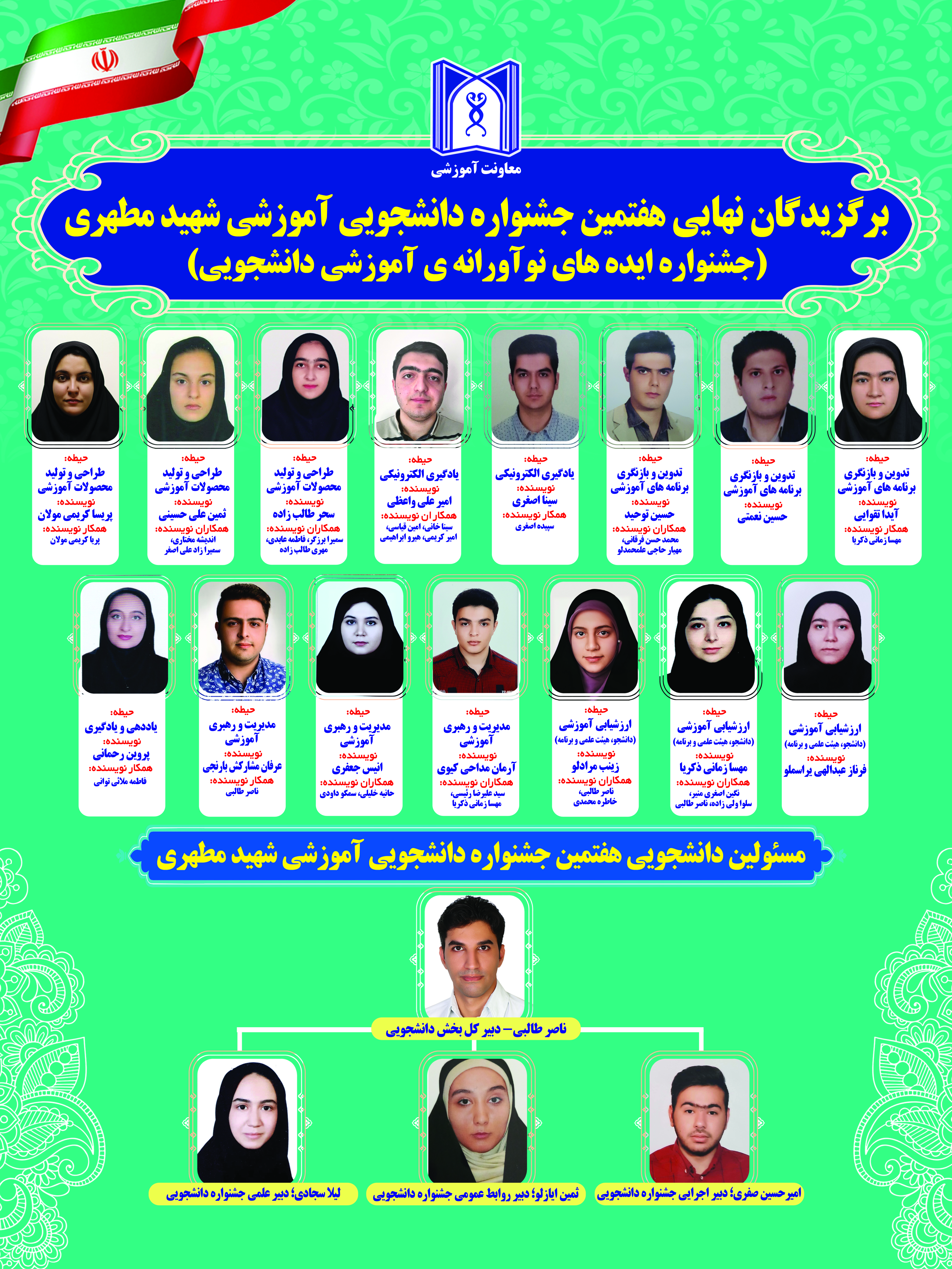 گفتنی است: در هفتمین جشنواره دانشجویی آموزشی شهید مطهری، دانشجویان جدیدالورود دانشکده علوم توانبخشی با مدیریت و حضور دبیر کل جشنواره دانشجویی ناصر طالبی دانشجوی سال آخر کاردرمانی و عضو دفتر استعداد های درخشان توانستند سهم بزرگی از بخش های اجرایی و علمی جشنواره را بر به نحو احسن عهده دار شدند .