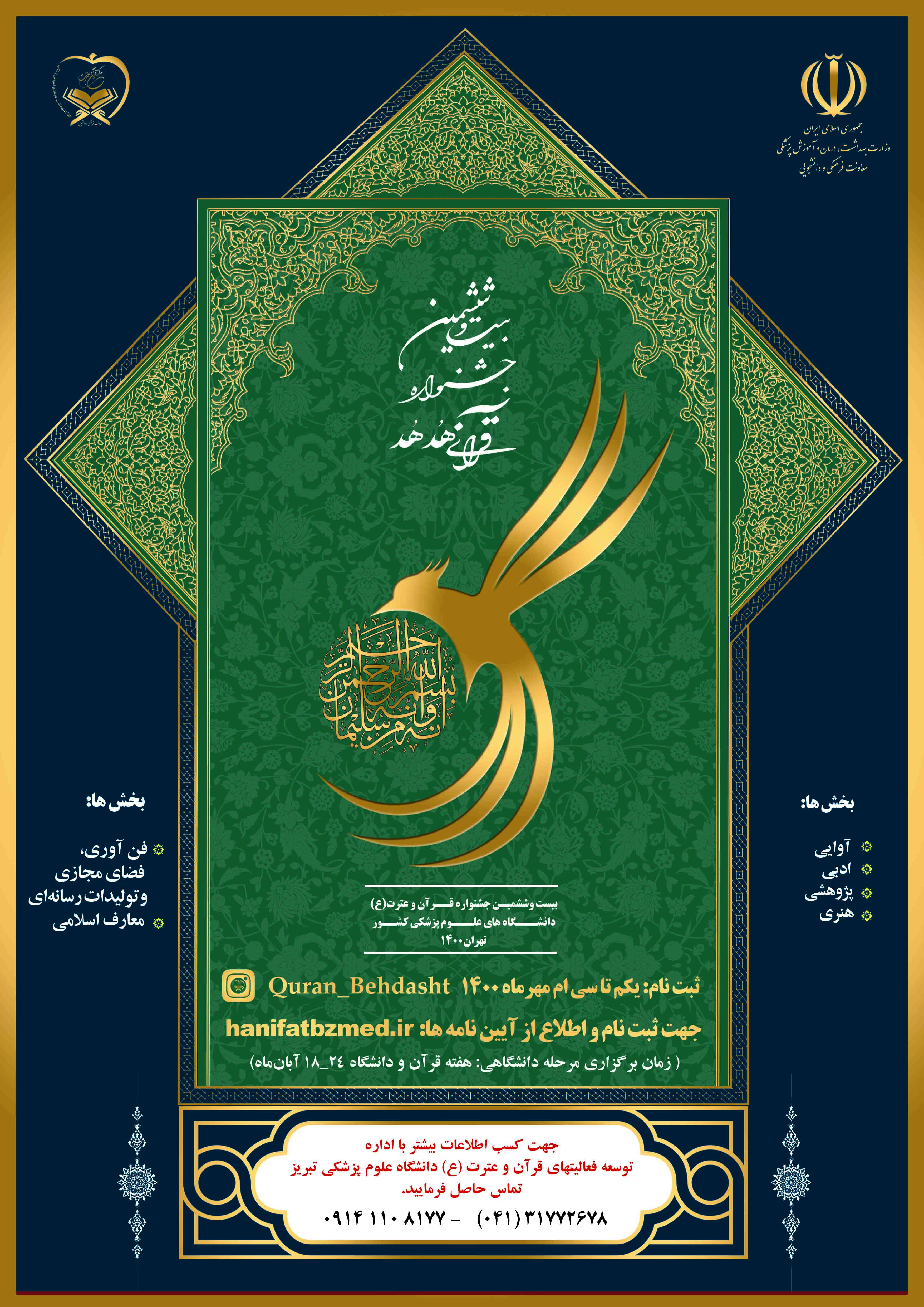 ثبت نام بیست و ششمین جشنواره قران و عترت (ع) ویژه اساتید ، کارکنان و دانشجویان دانشگاههای علوم پزشکی کشور از 1 مهر الی 30 مهر ماه آغاز شد