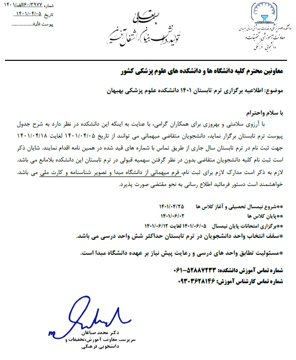 اطلاعیه برگزاری ترم تابستان 1401 دانشکده علوم پزشکی بهبهان