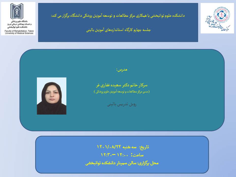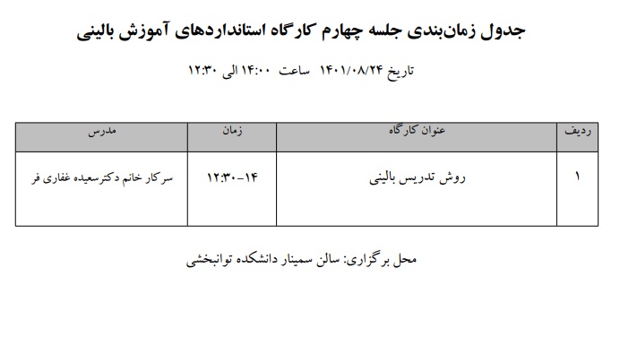 کارگاه کارگاه استانداردهای آموزش بالینی بدينوسيله به استحضارمیرساند جلسه چهارم .... کد خبر : 53599 کپی