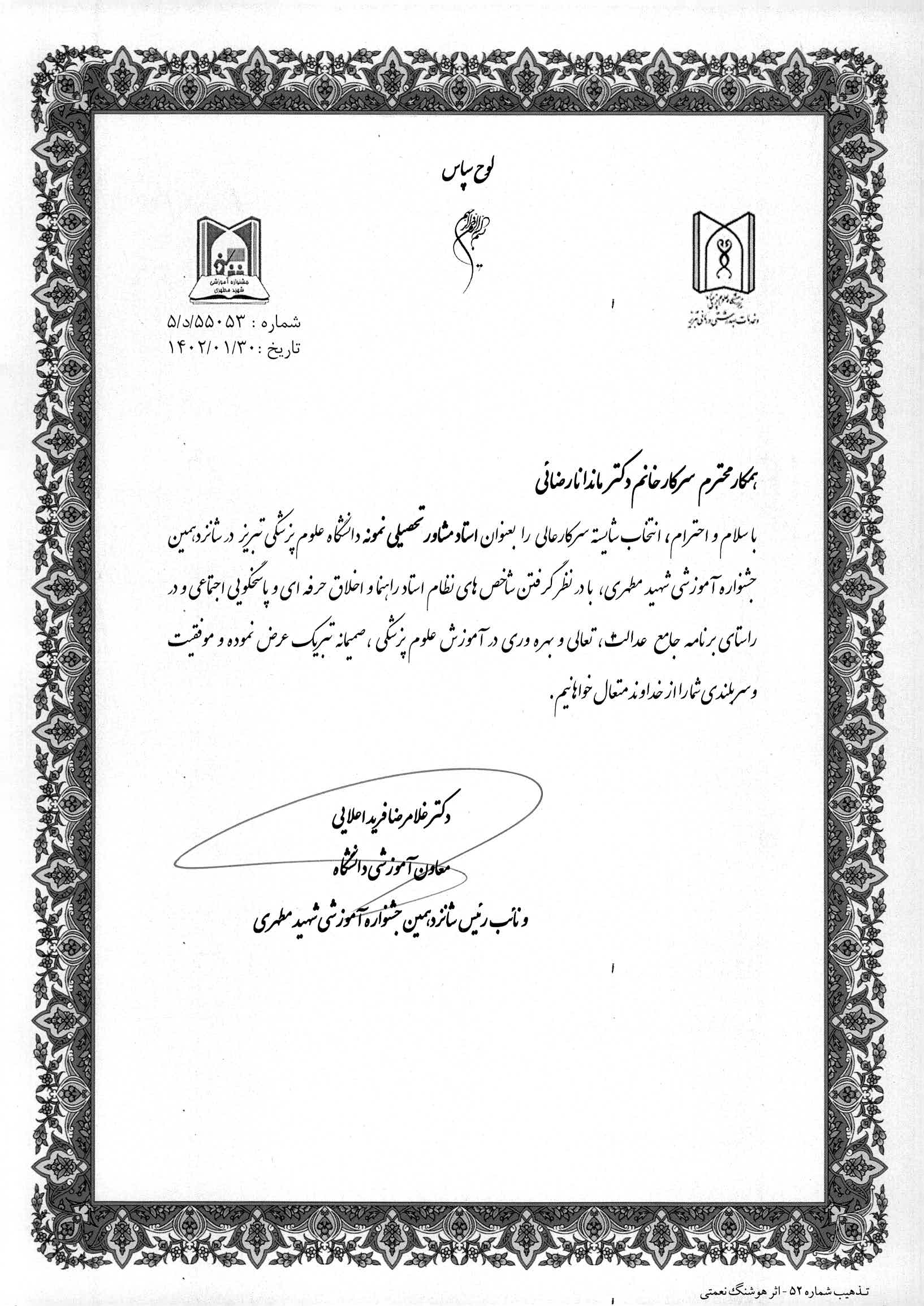 سرکار خانم دکتر ماندانا رضائی منتخب به استاد مشاور نمونه