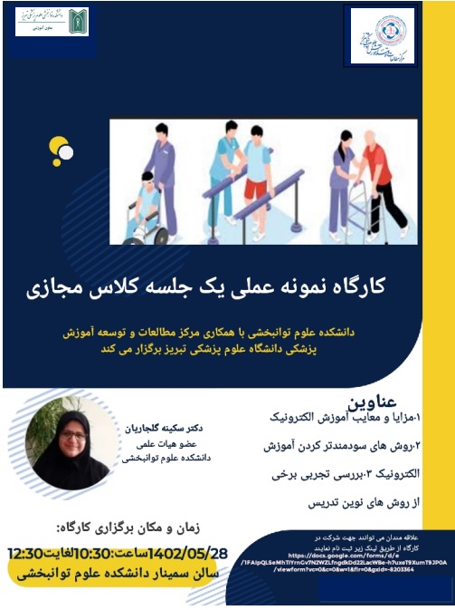 برگزاری کارگاه دانشکده علوم توانبخشی برگزار می کند. کارگاه نمونه عملی یک جلسه کلاس مجازی کد خبر : 53616 کپی