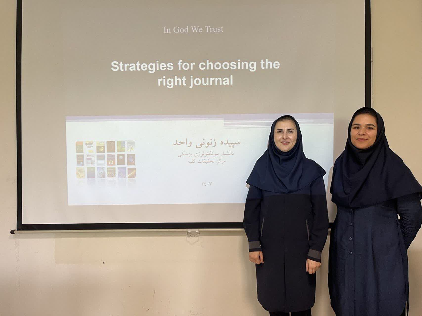 کارگاه پژوهشی با عنوان "استراتژی انتخاب مجله مناسب، مديريت ریتركت و مسائل پس از انتشار" روز يكشنبه مورخ ۱۴۰۳/۰۳/۲۷ از ساعت ۹ لغايت ۱۳ در دانشكده علوم توانبخشی با تدريس سركار خانم دكتر زنونی و بصورت حضوری برگزار گردید.